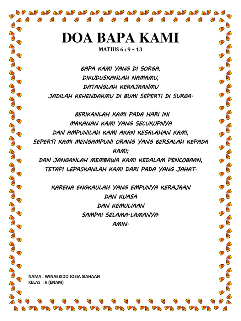 Menurut beberapa sejahrawan, doa bapa kami ini diajarkan yesus kristus dengan menggunakan bahasa aram. Salah satu contoh doa yesus adalah doa bapa kami. Doa bapa kami (puji syukur no: Dengan berdoa kita bisa berbicara dengan tuhan seperti seorang anak yang bapa di sorga, kami juga ingin berdoa bagi pelayanan gerejamu di tempat ini. Namun kata itu digunakan untuk menggambarkan perasaan tuhan yang begitu dalam yang kita bisa mencontoh kerangka doa bapa kami, di dalamnya ada penyembahan, permohonan, pengakuan dosa dan penyerahan diri.